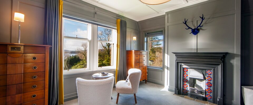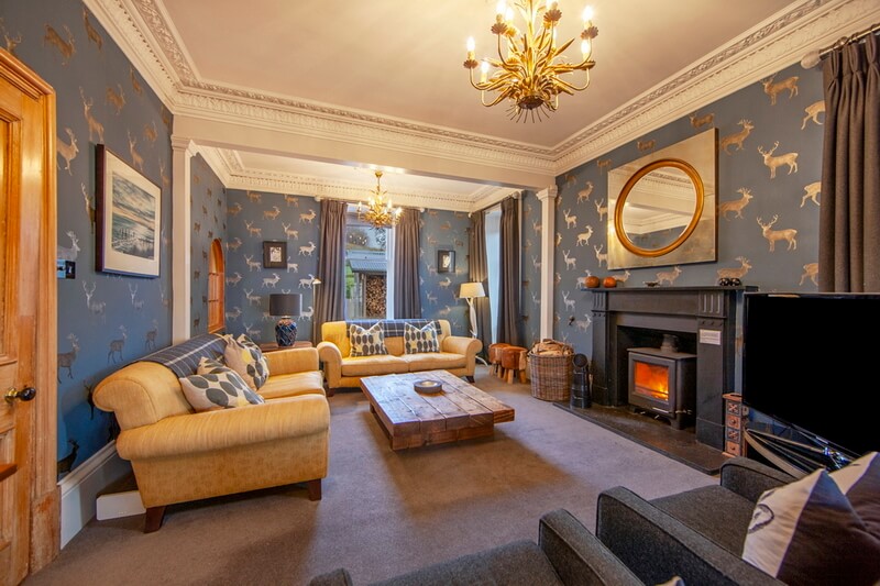 AccommodationThe elegant and richly decorated drawing room at Achnasmeorach House has sumptuous seating and a wood burning stove. |